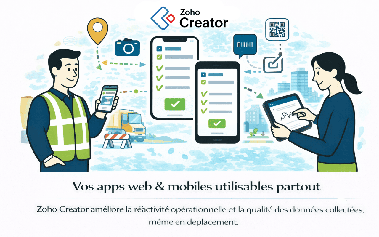 Offrez des apps web + mobile (iOS/Android) utilisables partout : saisie terrain, photos, signatures, géolocalisation, QRcode, Code barre, formulaires guidés et mode offline. Zoho Creator améliore la réactivité opérationnelle et la qualité des données collectées, même en déplacement.