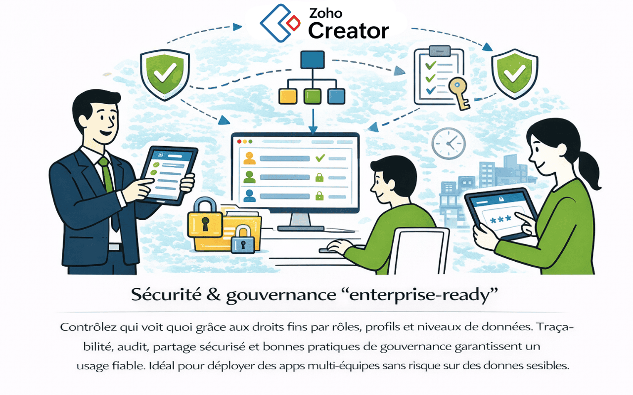 Contrôlez qui voit quoi grâce aux droits fins par rôles, profils et niveaux de données. Traçabilité, audit, partage sécurisé et bonnes pratiques de gouvernance garantissent un usage fiable. Idéal pour déployer des apps multi-équipes sans risque sur des données sensibles.