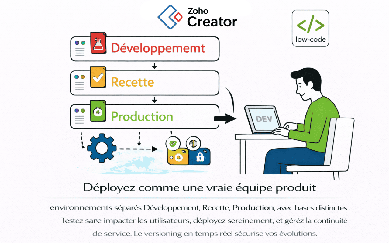 Déployez comme une vraie équipe produit : environnements séparés **Développement, Recette, Production** avec bases distinctes. Testez sans impacter les utilisateurs, déployez sereinement, et gérez la continuité de service. Le versioning en temps réel sécurise vos évolutions.